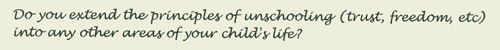 Trust and freedom affect everything at our house, and came before unschooling. Those principles apply to eating and sleeping, to what we believe about TV and video games, money, housework and music.